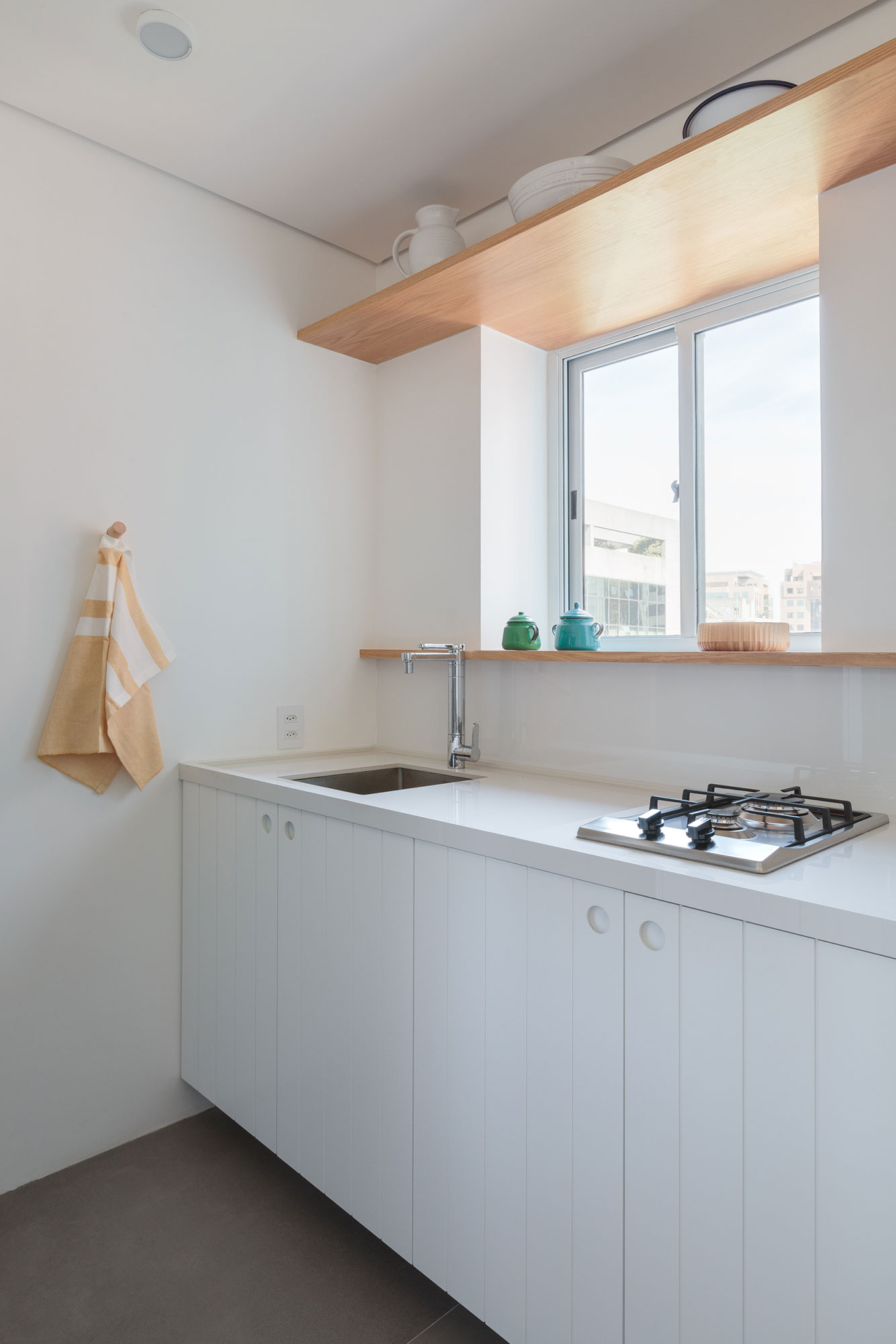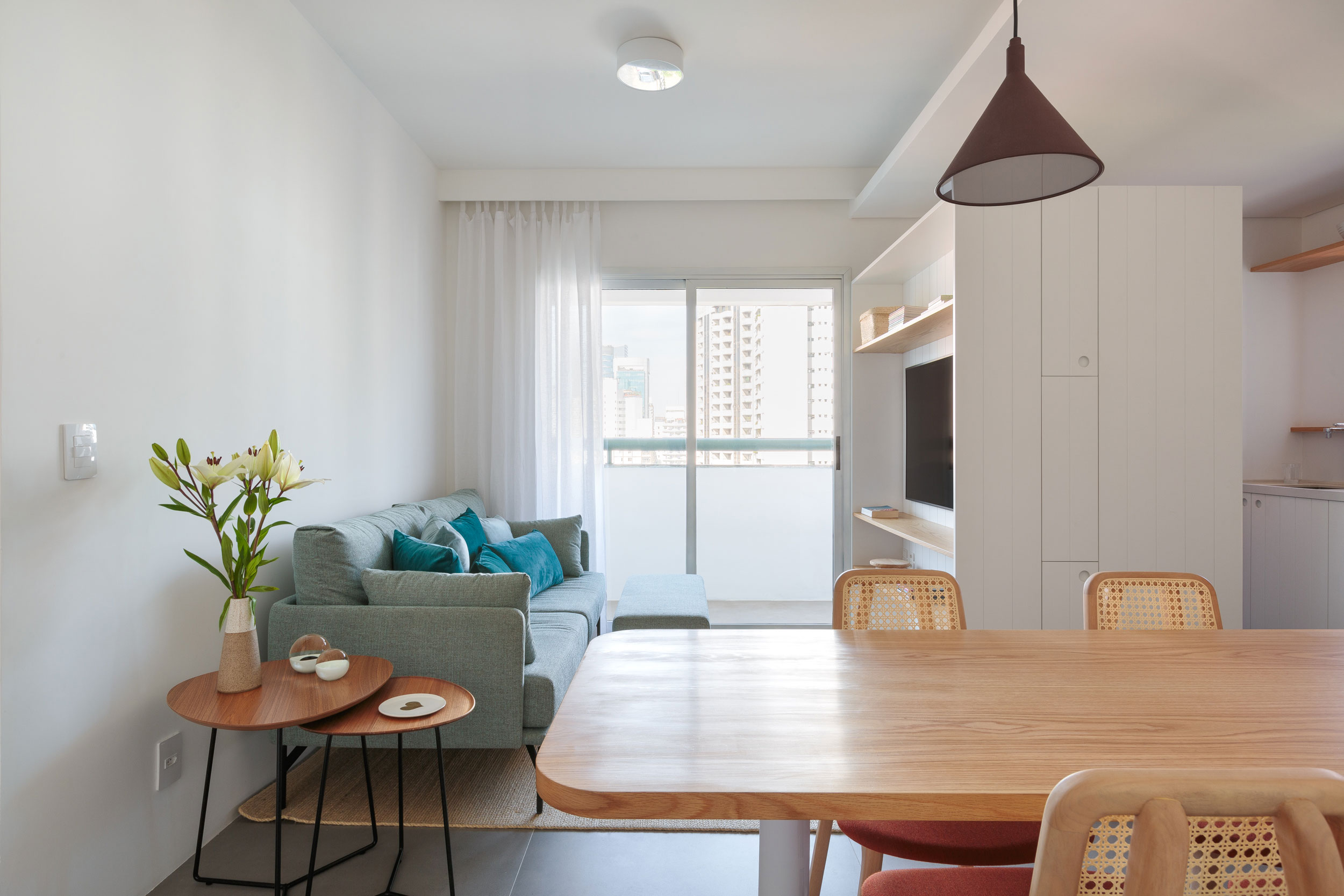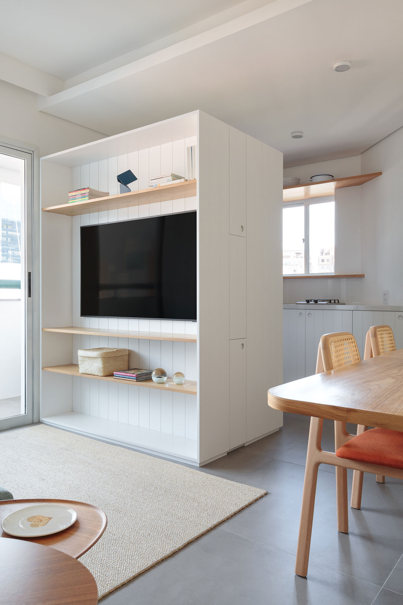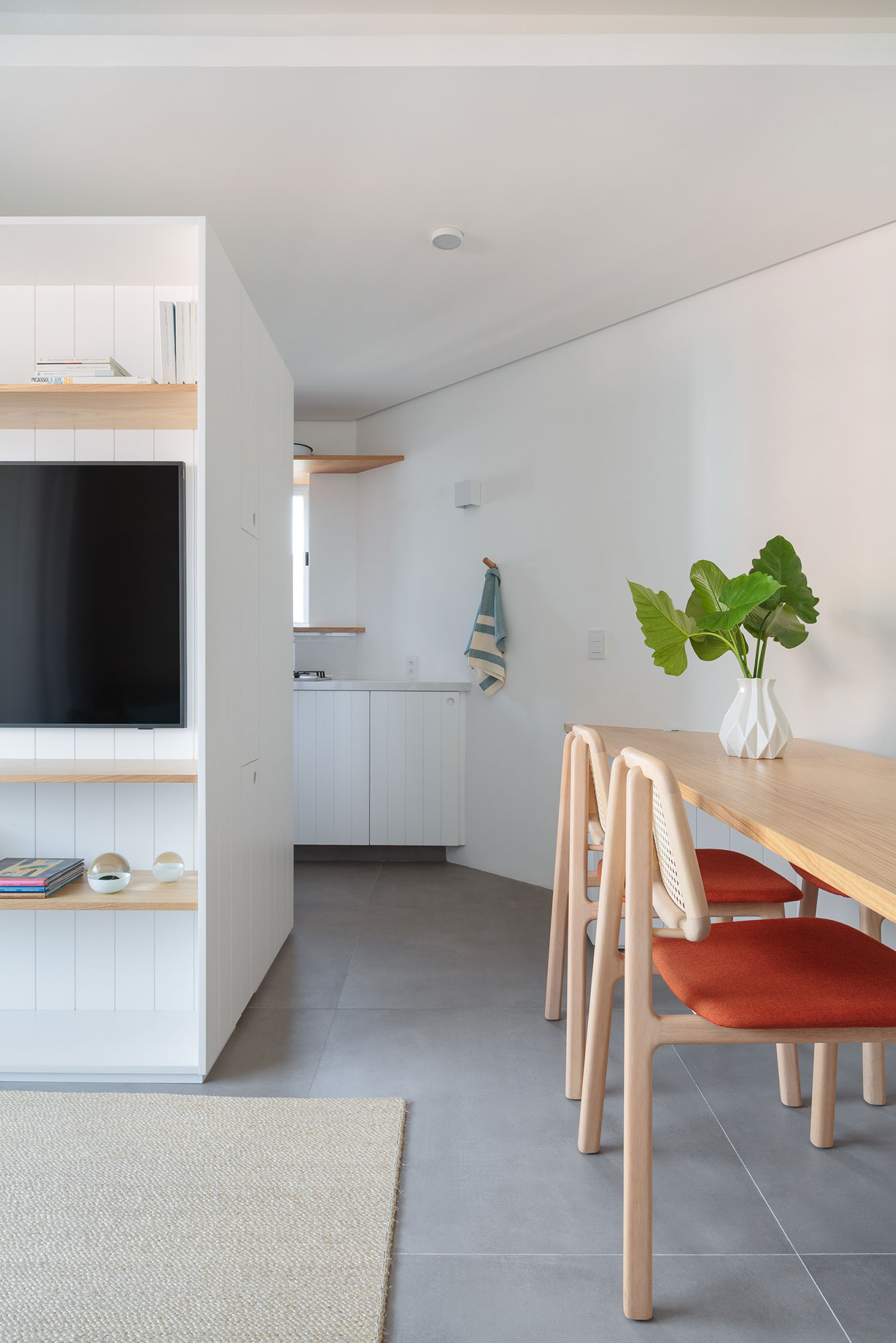 Na parte social do apartamento, em um ambiente pequeno com sala de estar, sala de jantar e cozinha integrados, o móvel de marcenaria de réguas brancas e detalhes em madeira atende as diferentes demandas de cada lugar.