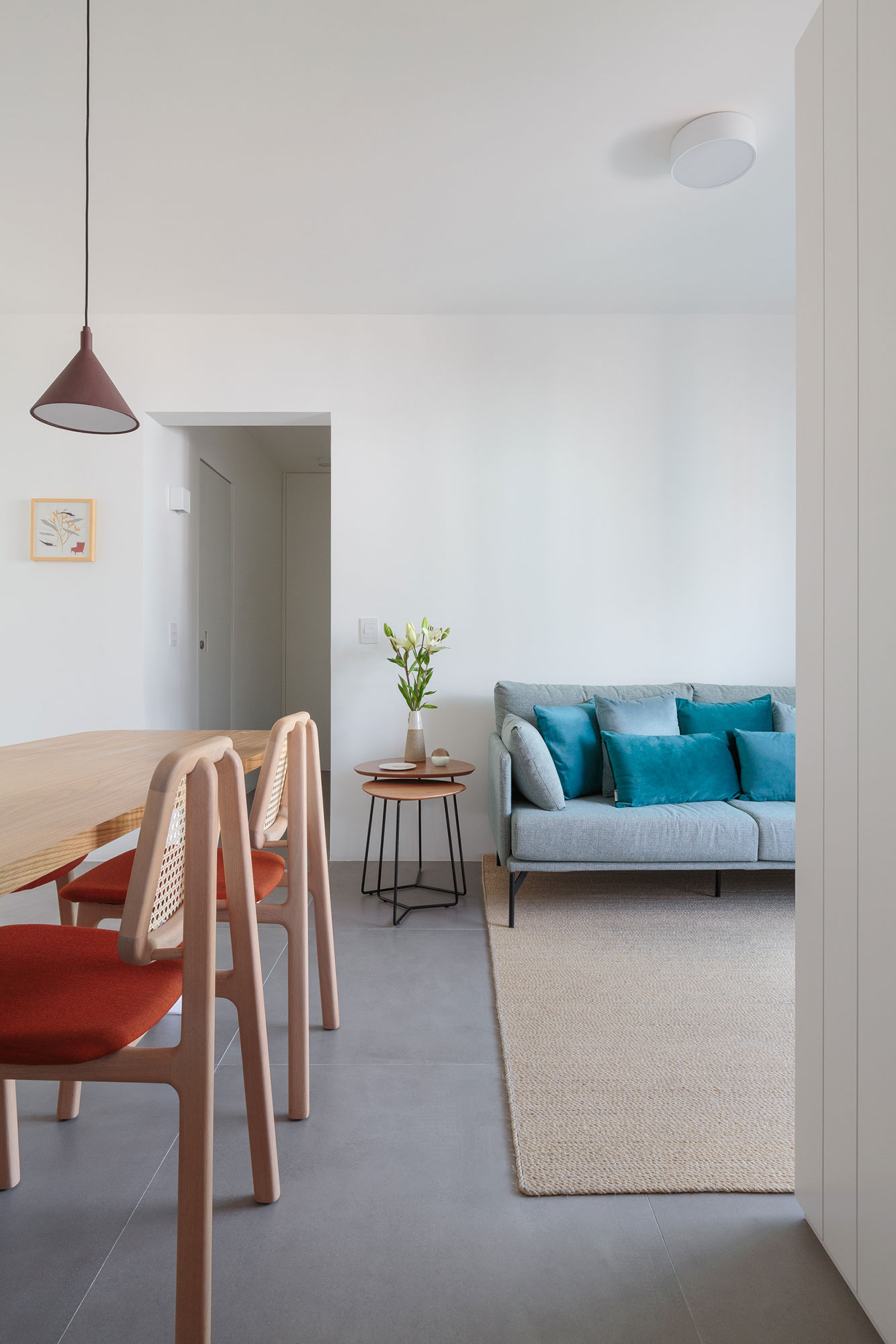Na parte íntima do apartamento, um único armário painel desempenha um papel importante na separação da circulação com os quartos. Além de sua função prática, esse armário também agrega um aspecto estético ao ambiente, sendo complementar na renovação do apartamento como um todo.