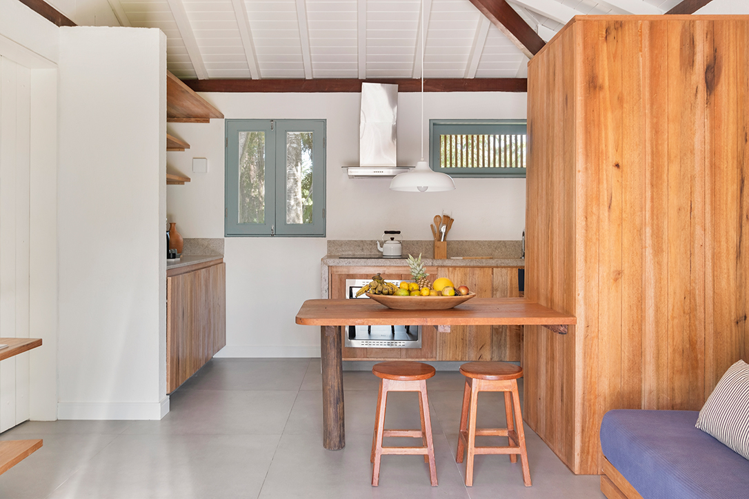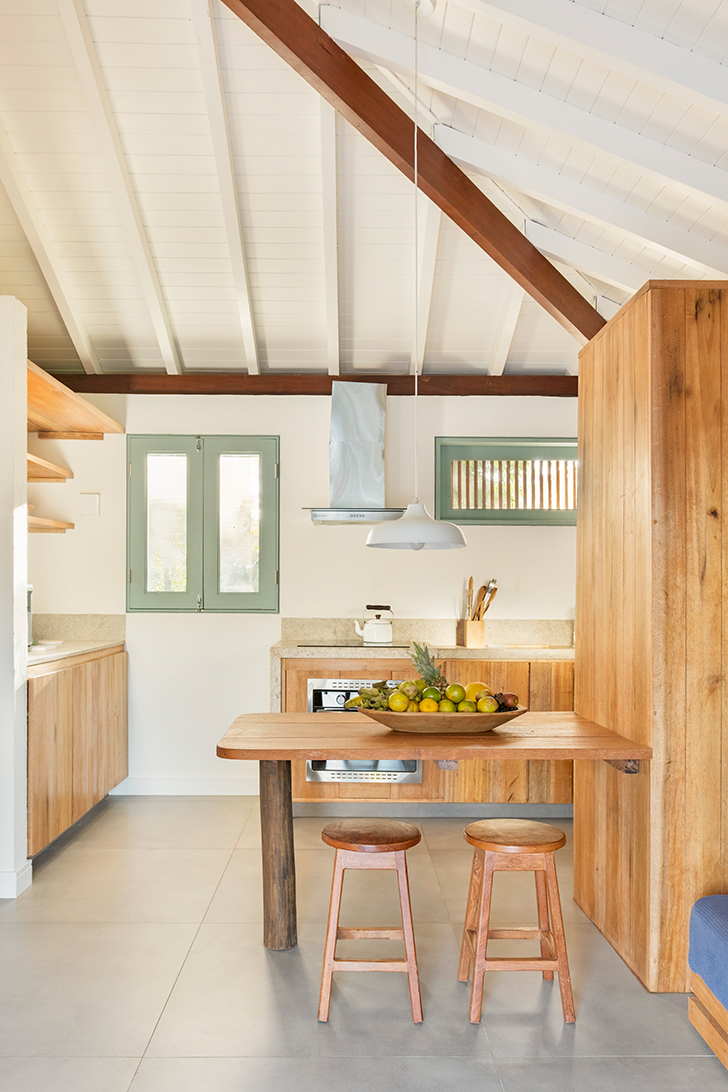 O bangalô todo feito em madeira, anexo ao volume principal, foi projetado como área de convívio. Um espaço gourmet aberto e arejado onde os ambientes internos e externos se integram pela presença de um deck ao ar livre que atravessa perpendicularmente o espaço coberto. Dentro da área protegida, pranchões de madeira, usadas como mesas e dispostas em direções opostas estruturam o ambiente, criando um espaço integrado e aconchegante.