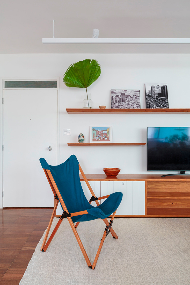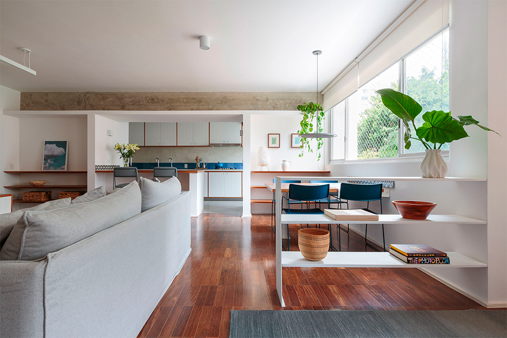 A integração do quarto com a sala, aliada à abertura da cozinha, transformou o apartamento em um espaço versátil e funcional, estimulando a interação entre os moradores durante os momentos de convívio.