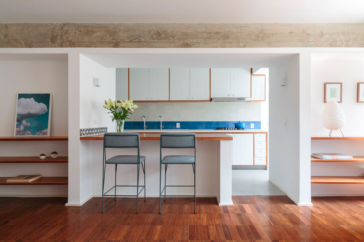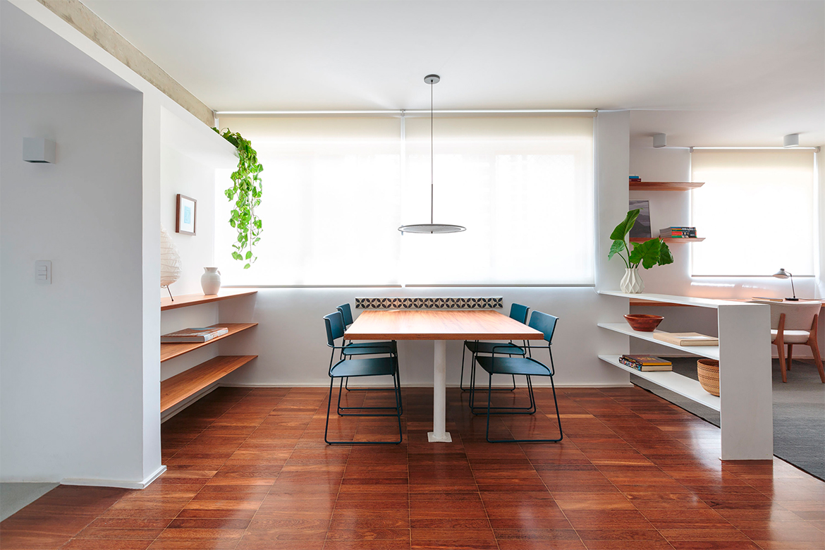 Para garantir uma transição suave entre a sala e a cozinha, foi feita uma bancada de madeira para usos diversos, tornando ponto central da casa. Os planos verticais e horizontais, com linhas retas e minimalistas de madeira e concreto, trouxeram uma espacialidade dinâmica para a organização do apartamento.