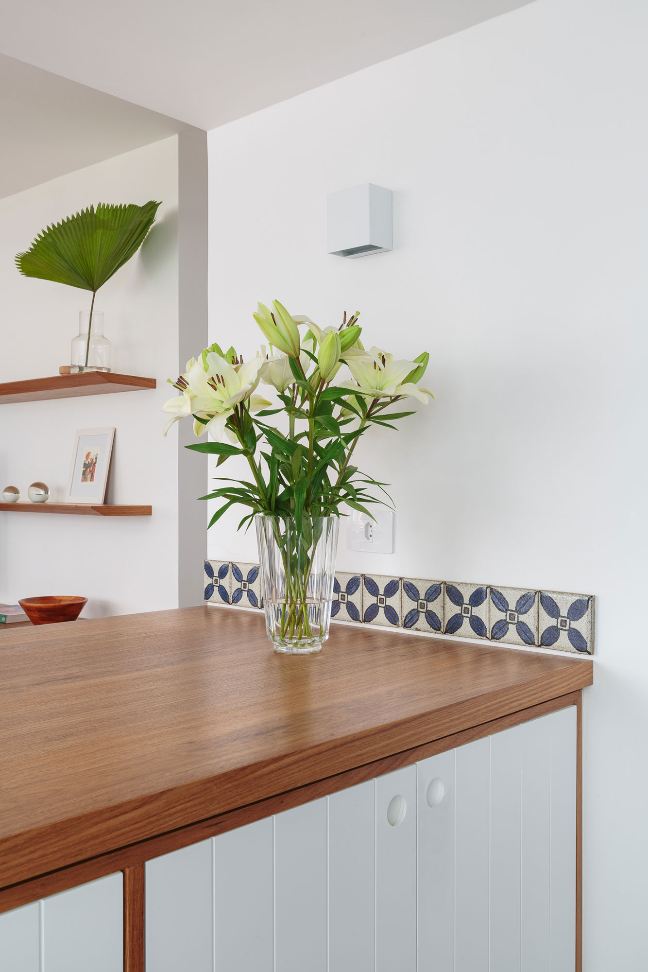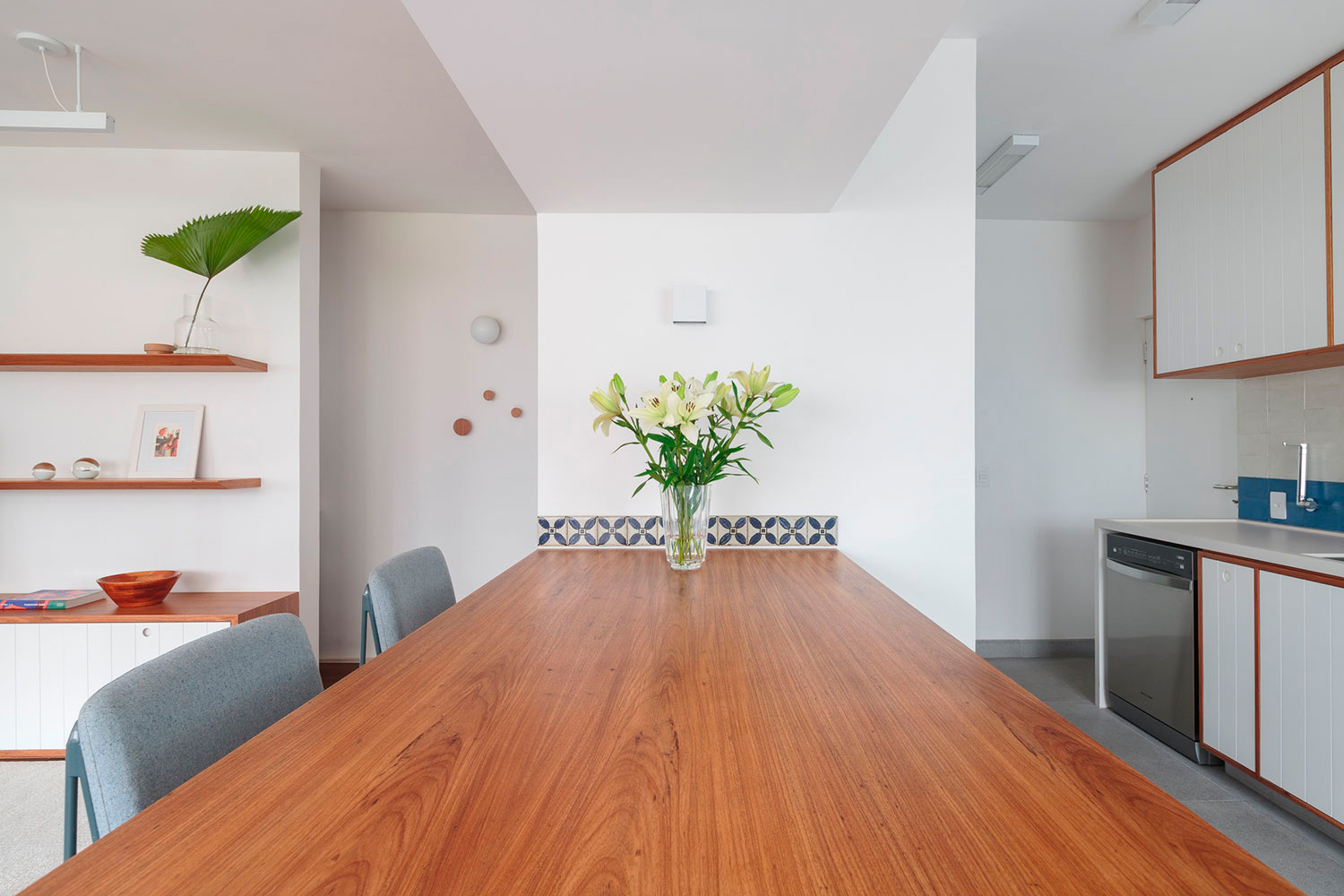 A disposição da cozinha foi feita de forma linear, permitindo uma fácil circulação entres as áreas de preparo e armazenamento. A marcenaria em pintura laca branca com detalhes em madeira, foi desenhada para maximizar os espaços. O frontão de ladrilhos com detalhes em azul trazem charme ao ambiente.