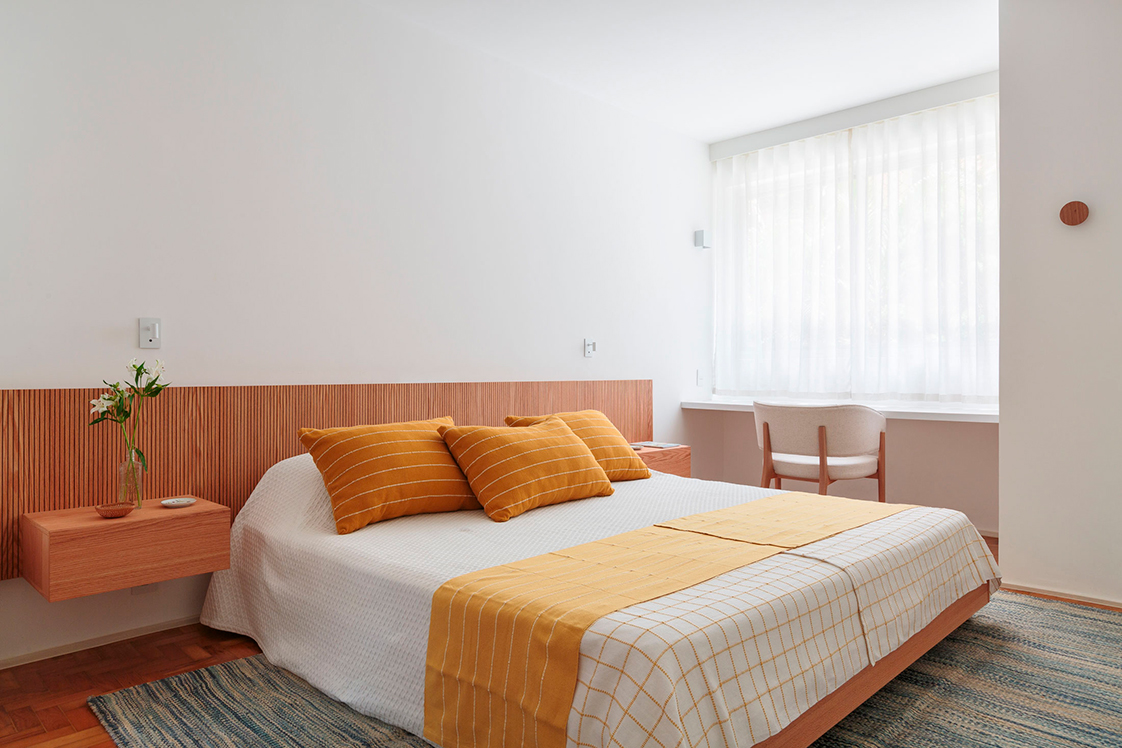 Na suíte, o painel de cabeceia traz conforto ao quarto.